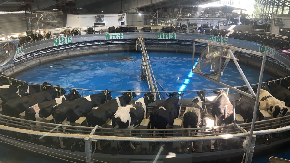“這個轉盤有80個擠奶位,每個位置正好站下一頭牛,牛走上擠奶位后,擠奶設備會自動與奶牛對接,自動擠奶就正式開始了!”8月29日,在商丘市虞城縣科迪智慧牧場,工作人員介紹著擠奶流程。
